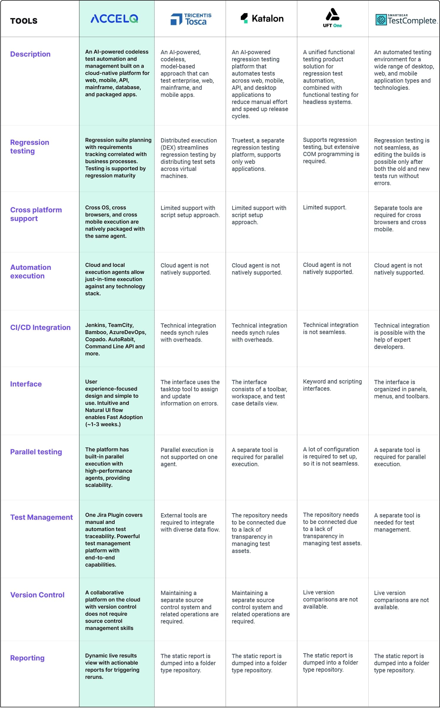 - Regression suite capabilities for mature testing are supported.