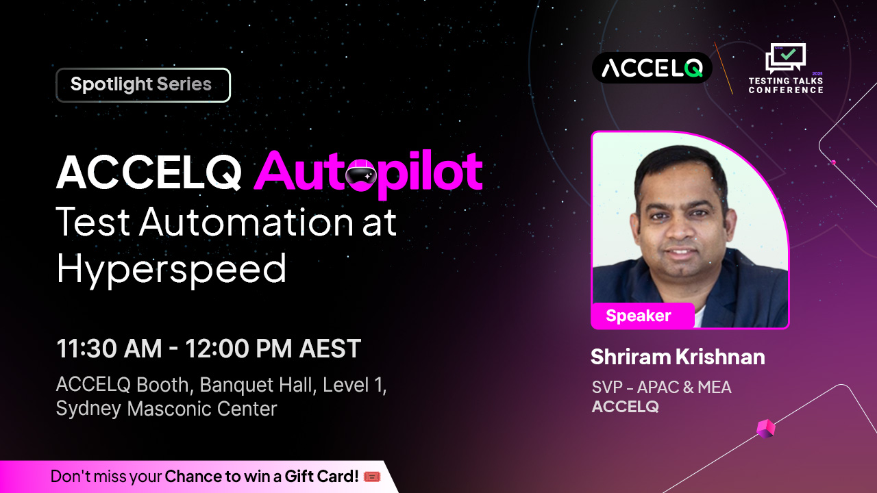 Join us for a Spotlight Session where ACCELQ will unveil ACCELQ Autopilot: Test Automation at Hyperspeed. Led by Shriram Krishnan, our expert will demonstrate how ACCELQ Autopilot redefines autonomous automation, enabling your entire team to achieve unprecedented speed and efficiency in their testing efforts. The session takes place from 11:30 AM to 12:00 PM AEST and get a chance to win a gift card!