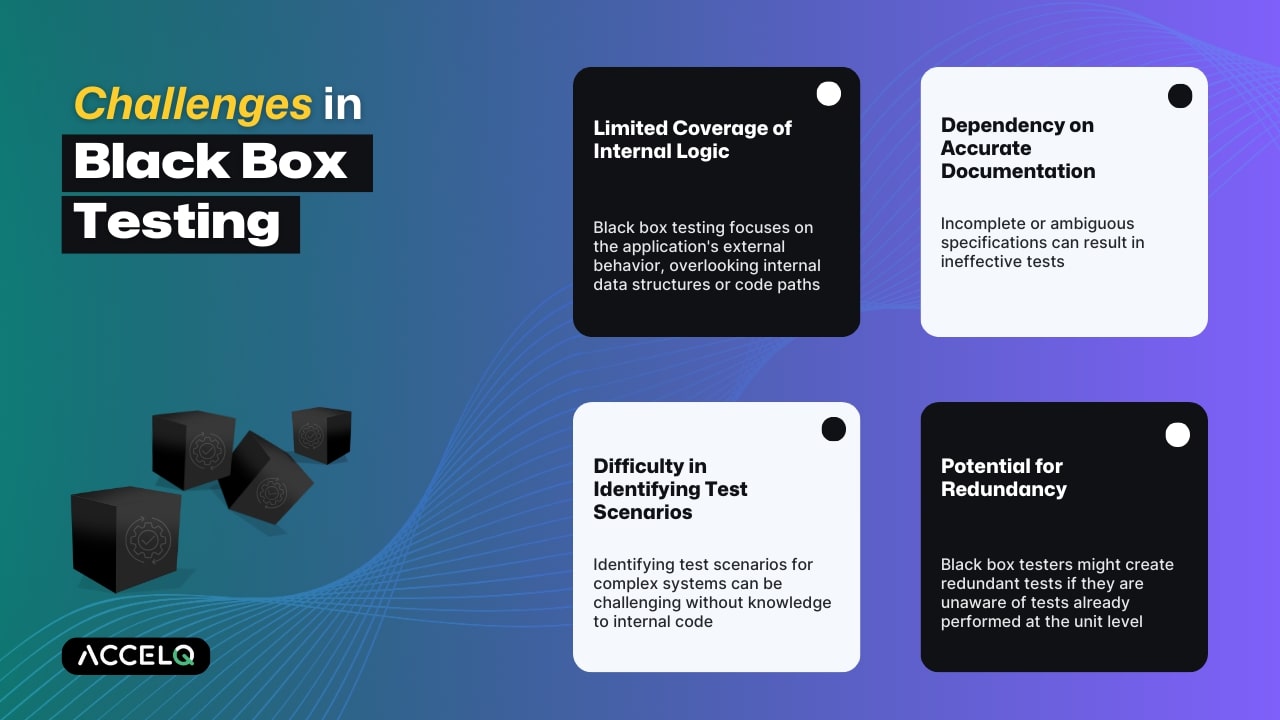 - Challenge: Since testers do not have access to the application’s internal structure, issues related to database transactions, algorithms, or system security may go unnoticed.