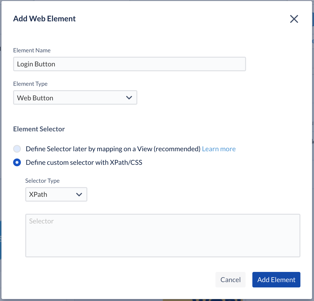 You can now specify an element’s advanced selector while creating an abstract web element. The view-based approach is still the preferred method for setting up element ID in ACCELQ. But this enhancement makes it easy to define XPath/CSS for the elements in a single step while you create an abstract element.