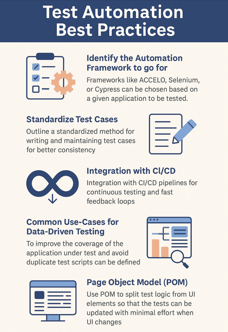 - Identify the Automation Framework to go for: Frameworks like ACCELQ, Selenium, or Cypress can be chosen based on a given application to be tested.