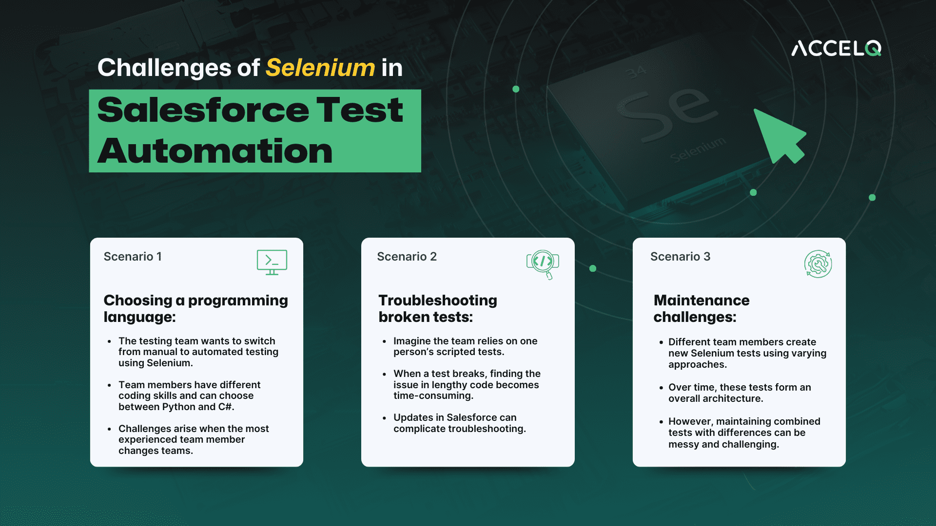 ACCELQ is a codeless test automation platform that allows testers to generate test cases for Salesforce easily. It is cloud-based and enhances the power of Selenium, making it reliable, scalable, and cost-effective.ACCELQ helps overcome the challenges mentioned above without the need for additional programming. Reach out to us to learn more about our Salesforce test automation solution.