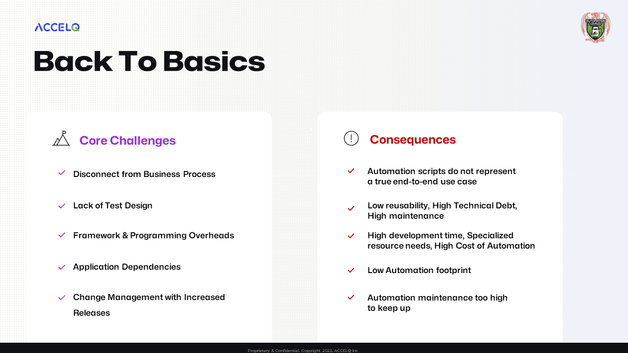 - Another impediment is the need for open-source test design. This was initially expected to address the core frustration of needing a sound test design at the foundation. However, this leads to low code reusability, high-tech debt, and high maintenance.