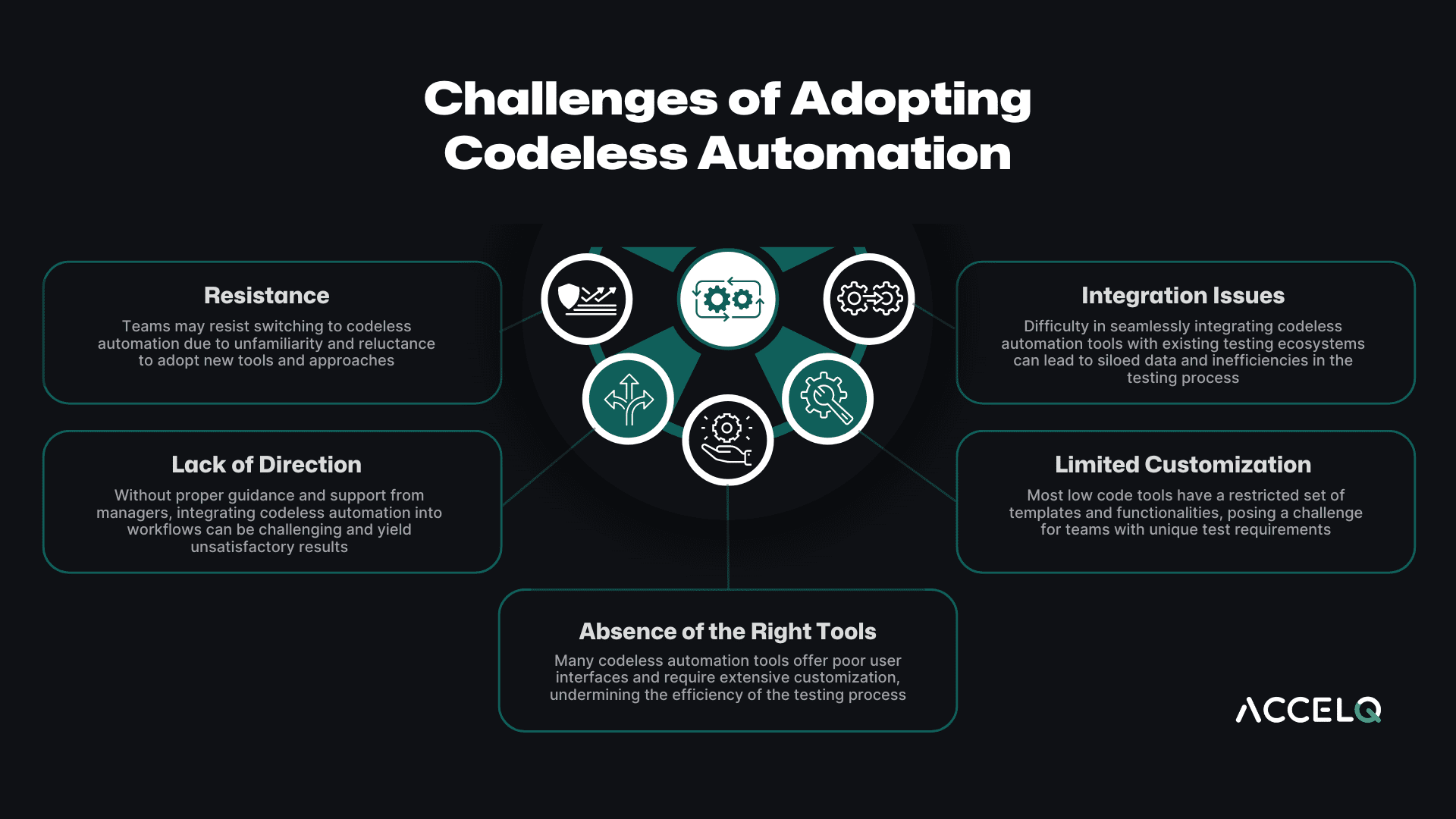 A lack of direction from managers and leaders is another common hurdle to adopting codeless automation. Very often, teams struggle to integrate codeless automation into their daily workflows. With testing teams stretched thin, limited support and backing from superiors lead to unimpressive results.