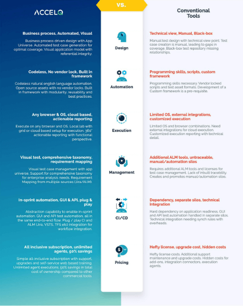 As a unified, codeless, and AI-powered test automation platform, ACCELQ offers all the capabilities today’s testers need to drive end-to-end business assurance. This next-gen agile quality management platform helps accelerate your testing cycle – so you can achieve continuous testing and delivery.